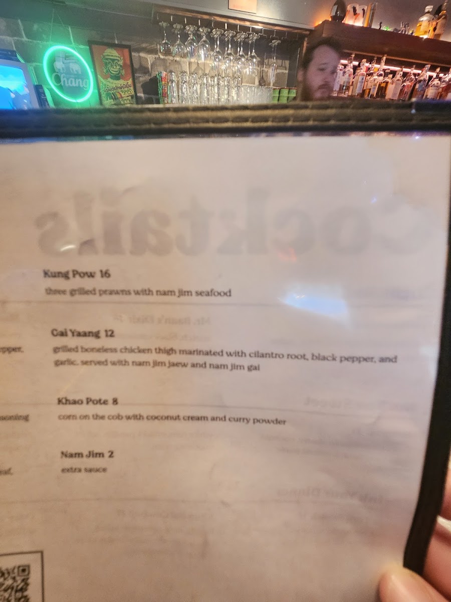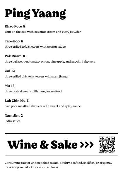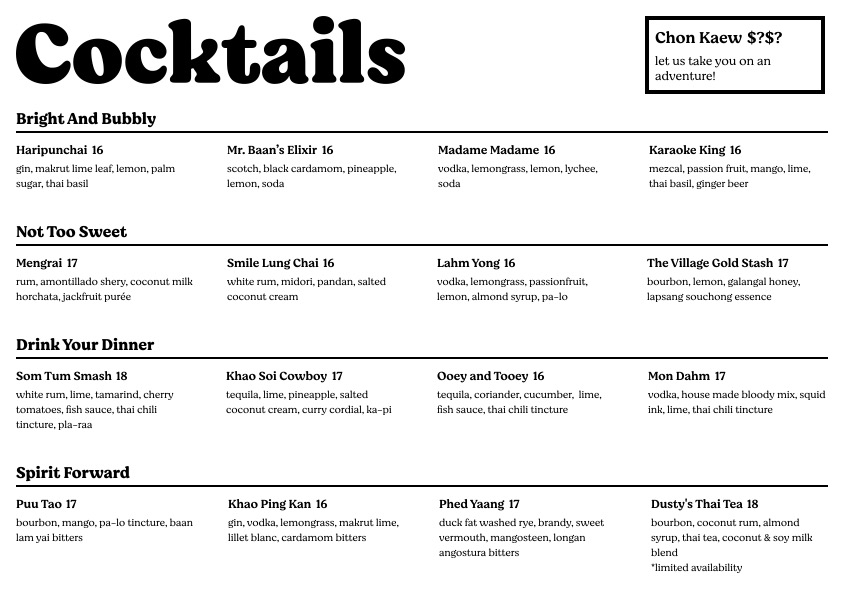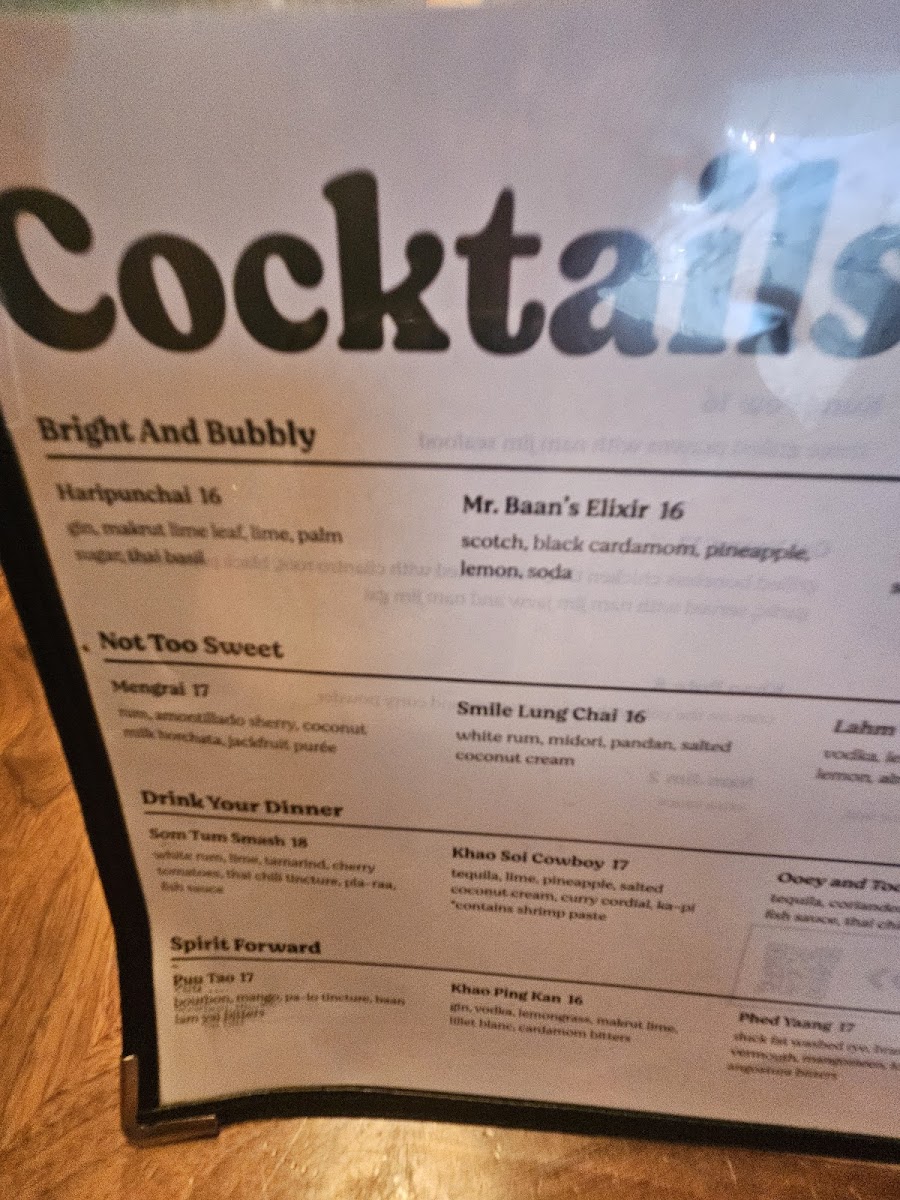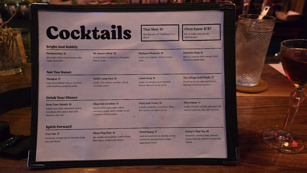 From a reviewer’s standpoint, the menu at Mr. Baan's Bar And Mookata offers a vibrant mix that caters to a range of tastes and moods. The Ping Yaang section features intriguing options like Tao-Hoo, Sua Rong Hai, Tua Samun PraiKhao Pote, and Sai Cawk Da Min Ces, showcasing the restaurant’s flair for bold, savory flavors. For those drawn to refreshing cocktails, Bright And Bubbly delivers with Haripunchal and Mr. Baan's Elixir, both of which provide a playful, effervescent lift. If you prefer drinks that lean Not Too Sweet, choices such as Mengrai and Smile Lung Chai balance flavor with subtlety. Adventurous diners will appreciate Drink Your Dinner, featuring creative concoctions like Som Tum Smash, Khao Soi Cowboy, and Ooey And TooeyMon Dahm, blurring the line between cocktail and cuisine. Finally, the Spirit Forward selections, including Puu Tao, Khao Ping Kan, Phed YaangDusty's Thai Tea, present a stronger, more robust profile for those who enjoy a deeper, richer sip. Overall, the menu impresses with its combination of playful creativity and thoughtful flavor pairings, making it a destination that satisfies both the palate and the curiosity of any diner.